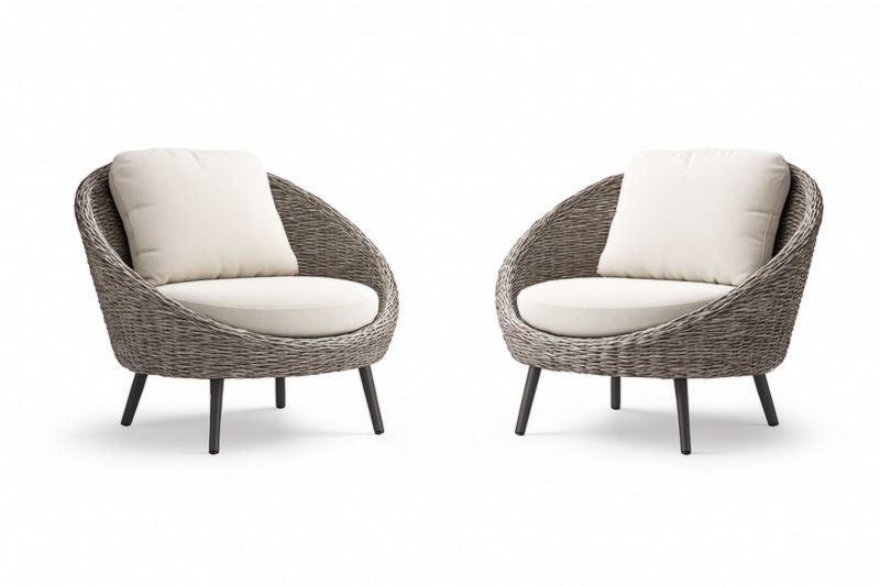 Lot de 2 fauteuils en résine tressée et métal gris coussins crème